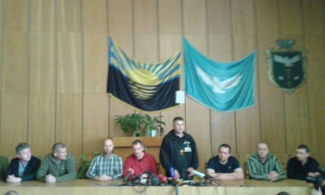 Захваченных военных инспекторов в Славянске показали прессе.