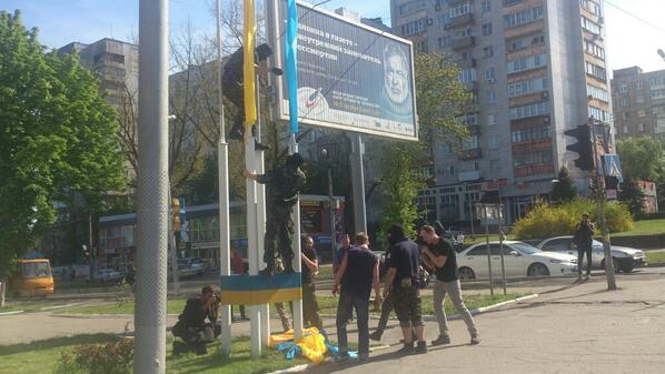 Сторонники ДНР после митинга в поддержку референдума прошли по проезжей части центральной улицы Донецка, по пути срывая с флаштоков у зданий национальные флаги Украины. Один из флагов был сожжен.