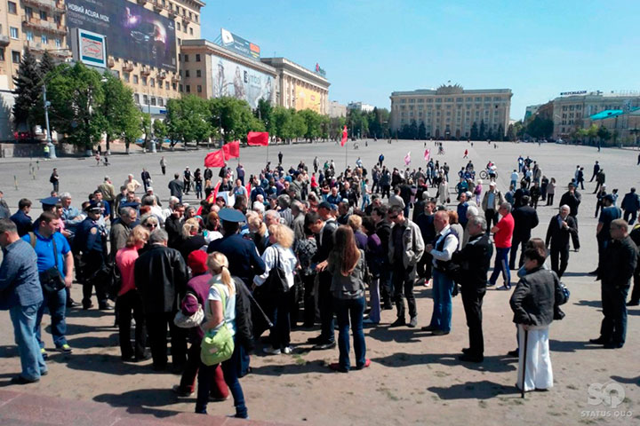 Митингующие держат флаги Компартии, а также движений "Боротьба" и "Юго-Восток". У них в руках плакаты "Краматорск, держись, мы с тобой", "Хунту долой", "Славянск – герой", "Одесса – Хатынь 21-го века".