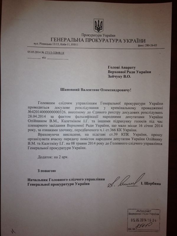 Так депутат отреагировал на документ, который прислала Генеральная прокуратура в аппарат Верховной Рады с требованием обеспечить явку Калетника и Олийныка по делу о фальсификации при подсчете голосов народных депутатов во время голосования 16 января в сессионном зале.