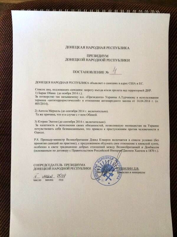 Президиум Донецкой народной республики своим постановлением №4 запретил въезд на территорию ДНР президенту США Бараку Обаме (до ноября 2014 г.), канцлеру ФРГ Ангеле Меркель (до сентября 2014 г.) и другим высокопоставленным чиновникам ЕС.
