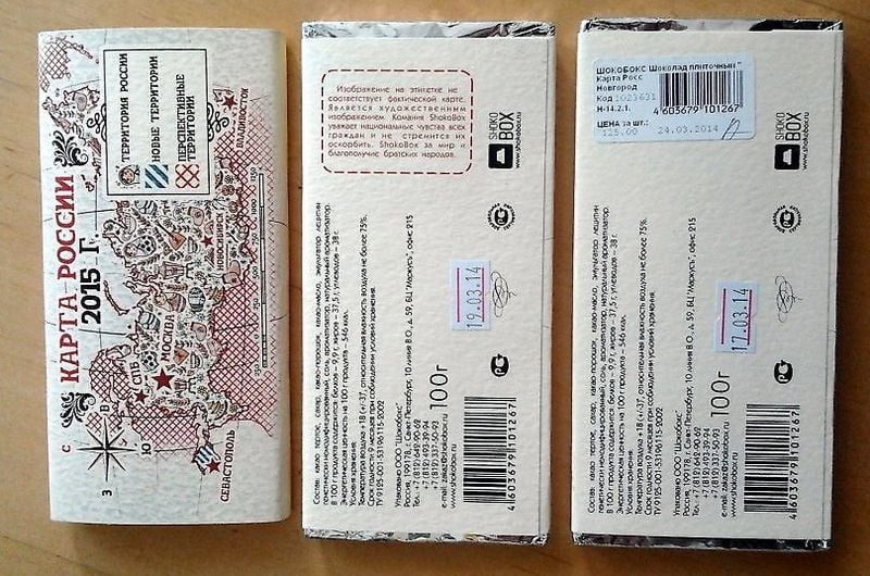 В России выпустили в продажу шоколад, на обертке которого изображена карта России на 2015 год.