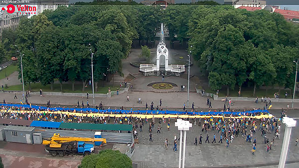 В Харькове Евромайдан проводит Народное вече. После митинга у памятника Шевченко активисты развернули огромные полотнища, символизирующие флаг Украины, и пошли к площади Конституции.