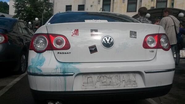 Митинг возле российского посольства в Киеве продолжается. Активисты переключились с обстрела здания яйцами на машины, припаркованные под посольством. Автомобили российских дипломатов облили зеленкой, прокололи колеса, а потом перевернули. Фотографии очевидцы публикуют в социальных сетях.