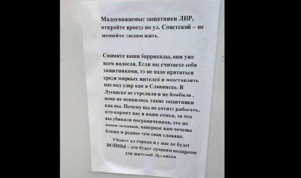 "В Луганске распространяются листовки, в которых жители города просят террористов и диверсантов покинуть город. В частности, жители требуют убрать баррикады из центральных улиц города, не прятаться за спинами мирных жителей и выйти из города", - заявил В.Чеповой на брифинге в пятницу в Киеве.