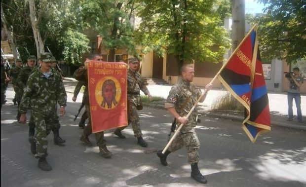 Они прошествовали по городу в одну из церквей во главе со своим лидером Игорем Гиркиным, который больше известен как "Стрелок". Как видно на фото, бойцы держали в руках флаг своего бандформирования и изображение Христа. На нем также была надпись "За веру. За царя. За святую триединую Русь".