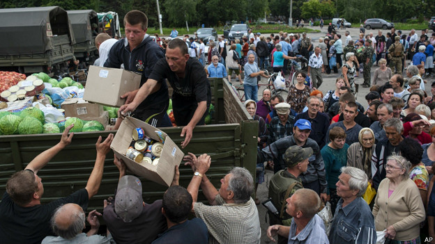 Газета Financial Times в своем репортаже из оставленного сепаратистами Славянска публикует фотографии раздачи населению продовольствия.
