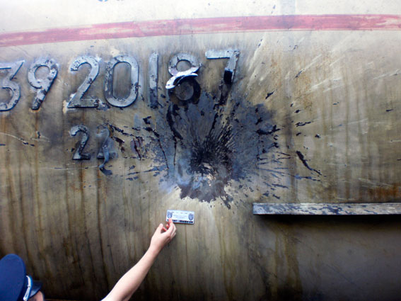 По данным правоохранителей, машинист грузового поезда услышал подозрительный звук, похожий на хлопок. По прибытию поезда на станцию "Занки" при осмотре цистерны на ней обнаружили вмятину размером около одного метра.