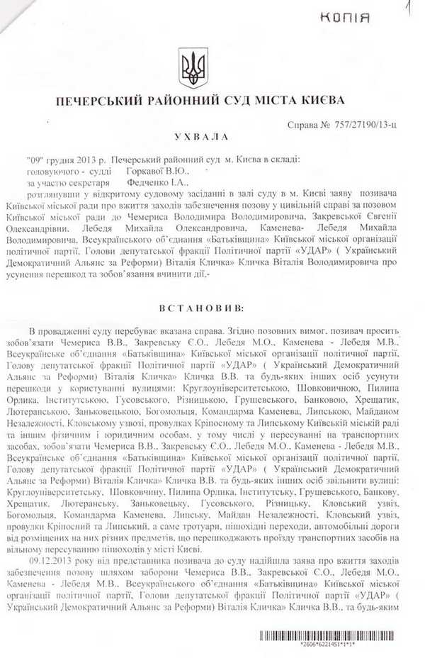 Глава Временной следственной комиссии Верховной Рады Геннадий Москаль получил постановление Печерского районного суда Киева от 9 декабря 2013 года, которым митингующим, политическим партиям и общественным организациям запрещено проводить акции протеста в центре Киева.