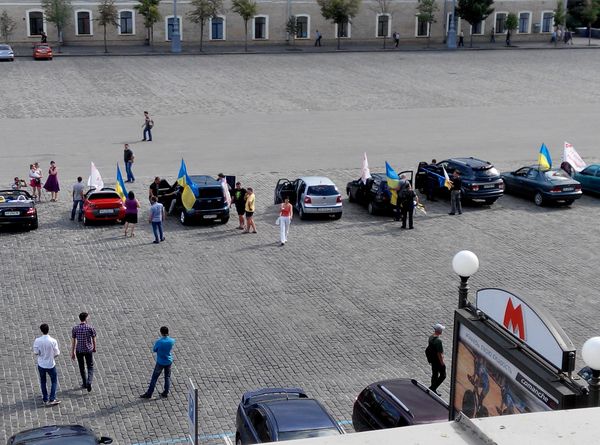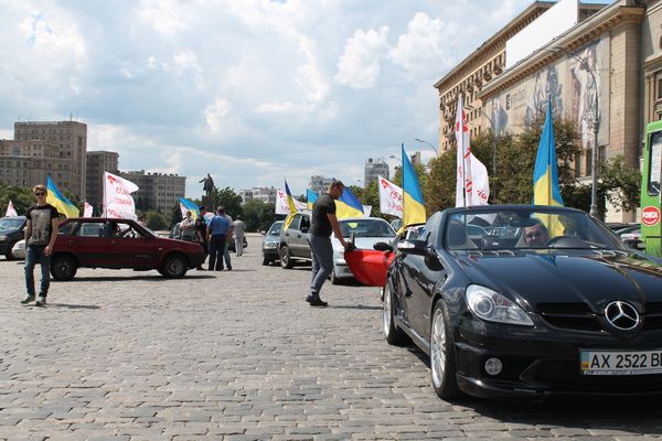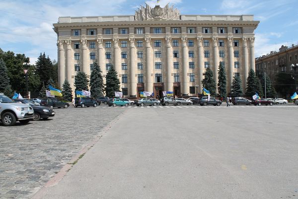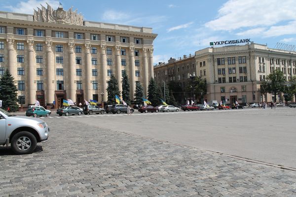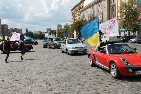Автомобилисты Харькова в ответ приветствовали несколько десятков машин с национальными флагами и флагами с надписью "Батькивщина. 15 лет ", нажимая на клаксоны в своих автомобилях и аплодируя.