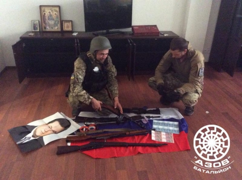 «В Мариуполе бойцами спецбатальона «Азов» на рынке, принадлежащем родственнице экс-президента Януковича, обнаружен арсенал оружия, георгиевские ленты, флаги «ДНР» и РФ, а также фальшивые гривневые купюры», - сказано в сообщении.