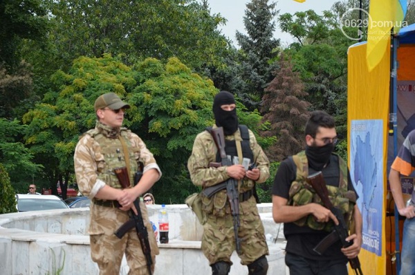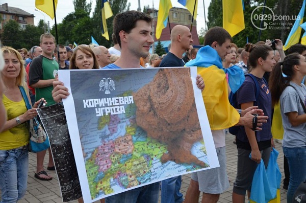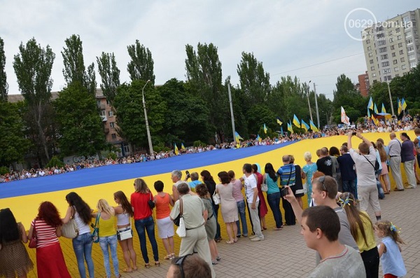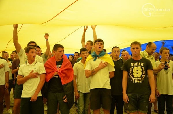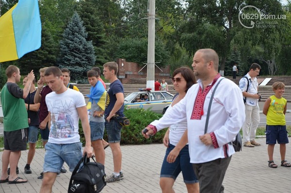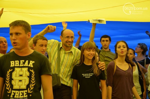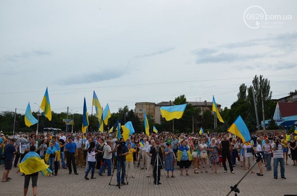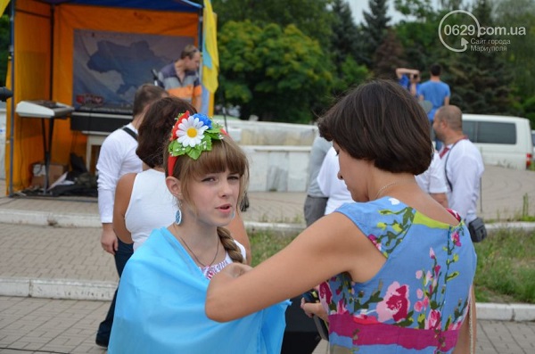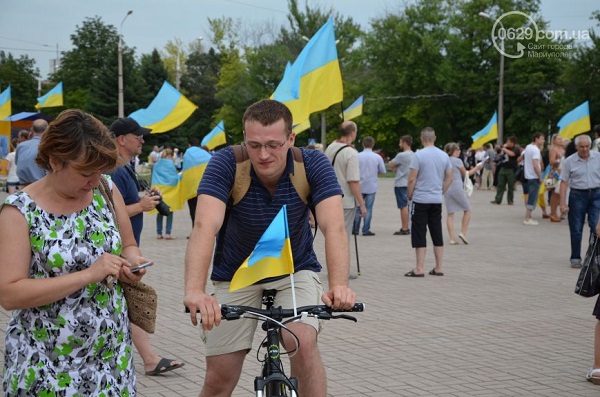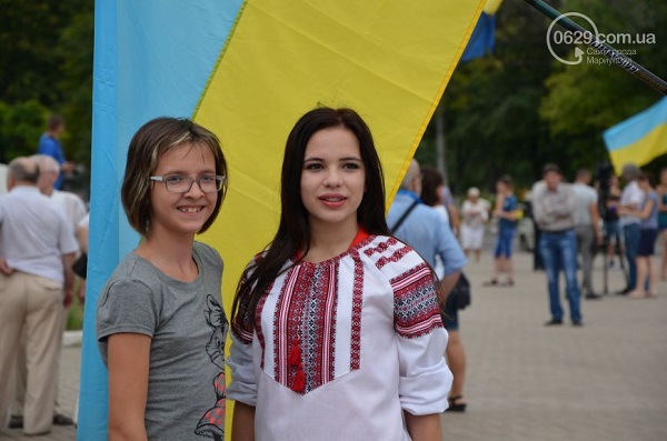 Участники мероприятия – мариупольцы всех возрастов, многие из них пришли либо в одежде с украинской символикой, либо с украинскими флажками, люди пели гимн Украины и скандировали «Слава Украине! Героям слава!».