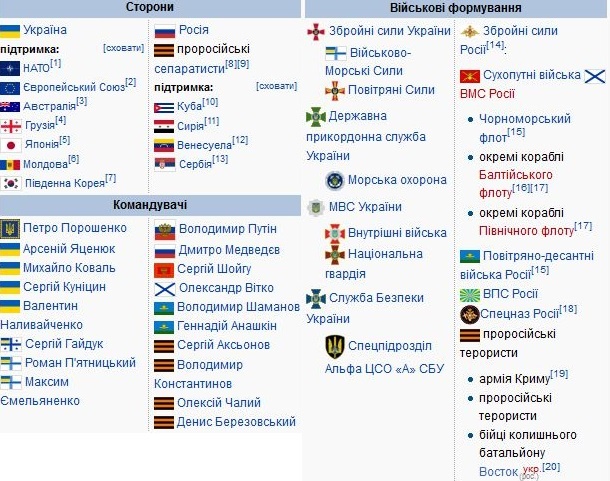 В украиноязычном разделе онлайн-энциклопедии Википедия появилась статья об интервенции России в Украину. Материал описывает происходящие события как войну двух стран.