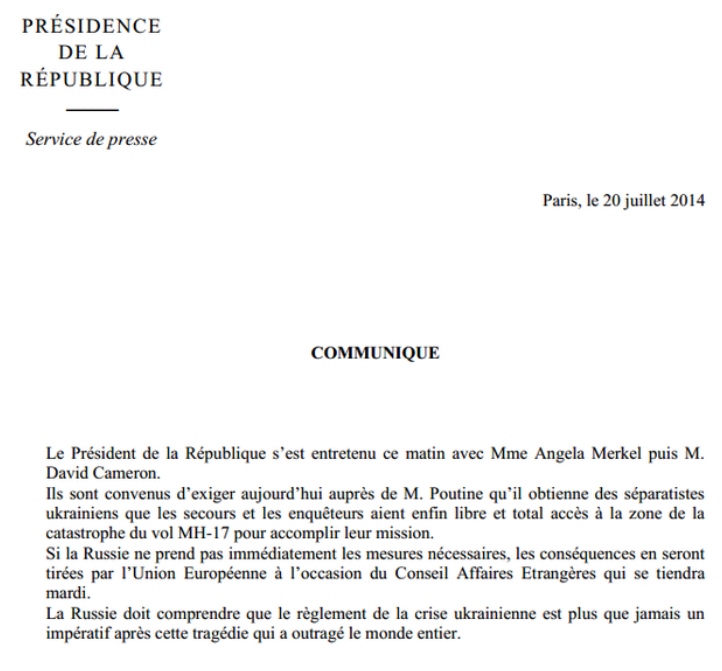 Германия, Великобритания и Франция призвали президента России Владимира Путина повлиять на пророссийских террористов, чтобы они предоставили международным экспертам полный доступ к месту крушения Boeing 777 авиакомпании Malaysia Airlines в Донецкой области. Об этом сказано в совместном заявлении канцлера Германии Ангелы Меркель, премьер-министра Великобритании Дэвида Кемерона и президента Франции Франсуа Олланда по итогам телефонного общения.