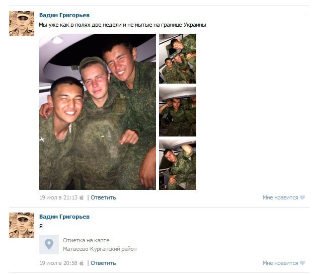 Фотографии Григорьева во "ВКонтакте" привязаны к карте, и судя по информации, были сделаны в Матвеево-Курганском районе Ростовской области (РФ), который граничит с Донецкой областью Украины.