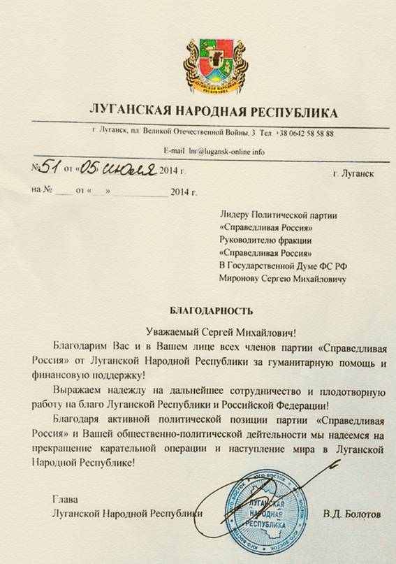 Установлено, что на официальном сайте политической партии Российской Федерации «Справедливая Россия» был размещено письмо Председателя так называемой «Луганской Народной Республики» (далее – «ЛНР») Болотова В.Д. от 05.07.2014 № 51, адресованное Председателю указанной политической партии Миронову С.М.