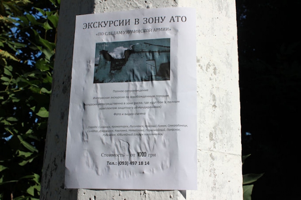 Двухчасовая экскурсия обойдется экстремалам от 1000 до 8000 тысяч гривен, в зависимости от того, как близко те пожелают оказаться от города, где на данный момент все еще ведутся бои с террористами, сообщает УНИАН со ссылкой на издание "В Кулаке".