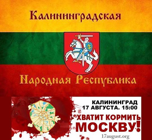 Между тем сегодня в сетях появился новое подобное объявление только из Калининградской области. На фоне флага Литвы «Калининградская народная республика» объявляет сход на 15:00 под лозунгом «Хватит кормить Москву!»