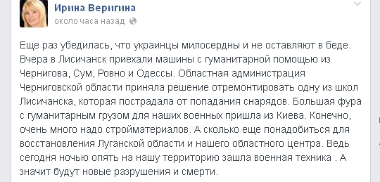 "Сегодня ночью опять на нашу территорию зашла военная техника. А значит будут новые разрушения и смерти", написала она.