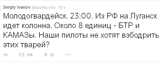 Информация о передвижении российской военной техники также подтверждается местными активистами. Об этом, в частности, сообщал в своем микроблоке в Twitter Сергей Иванов.