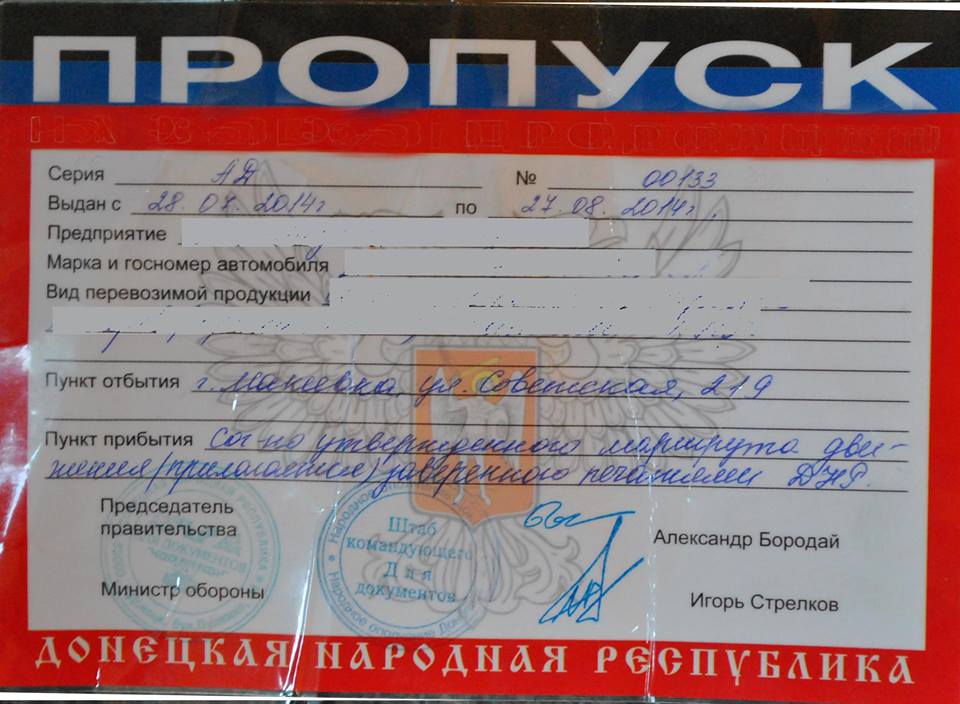 Также в автомобиле был найден пропуск ДНР, выписанный 28 июля самозваными «председателем правительства» Александром Бородаем и «министром обороны» Игорем Стрелковым, а также таблички с надписями «Дети», «Груз 200».