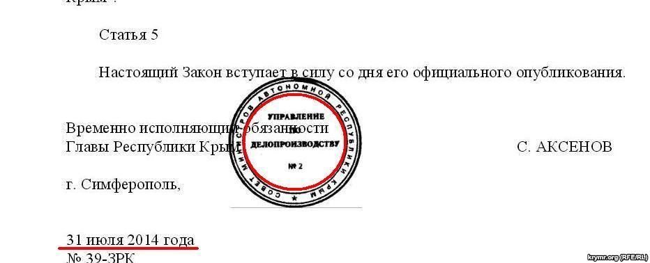 В частности, печатью "Совет министров Автономной Республики Крым" визируются законы, подписанные самопровозглашенным премьер-министром Крыма Сергеем Аксеновым. Такие же печати присутствуют и на других законах "Госсовета", которые подписывал Аксенов в последнее время, в том числе, и несколько дней назад.
