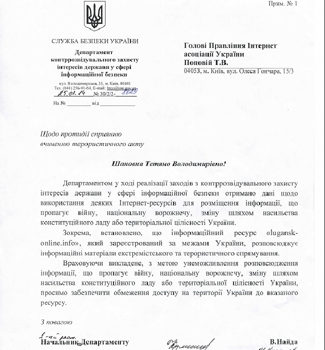 В письме, в частности, указывается, что департамент контрразведывательной защиты интересов государства в сфере информационной безопасности получил данные относительно использования отдельных Интернет-ресурсов для размещения информации, пропагандирующей войну, национальную вражду, изменение путем насилия конституционного строя или территориальной целостности Украины.