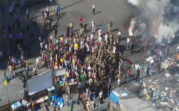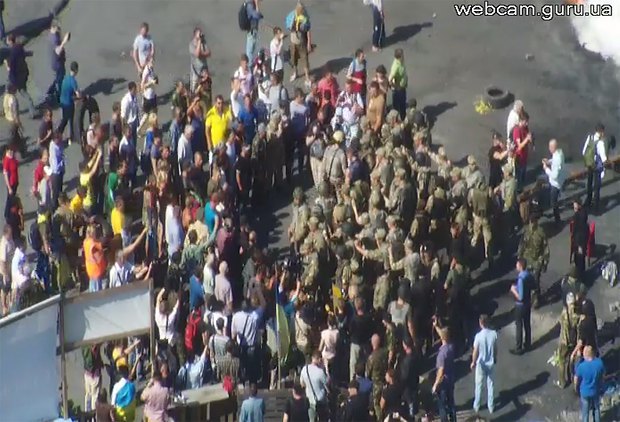 Некоторые "майдановцы" ведут себя довольно неадекватно. В частности, какой-то мужчина начал кричать: "Взрываю". После этого его повязали, но кто именно - милиция или его товарищи - узнать пока не удалось.