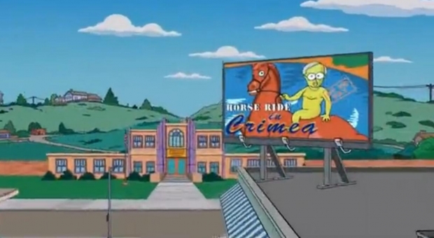 В кадре отчетливо видно биг-борд, на котором изображен обнаженный мужчина, похожий на Путина, на лошади. Биг-борд рекламирует верховую езду в Крыму. Также, в конце заставки главный герой сериала Барт Симпсон пишет на доске много раз Putin H***o, созвучное с популярной песней украинских футбольных фанатов.