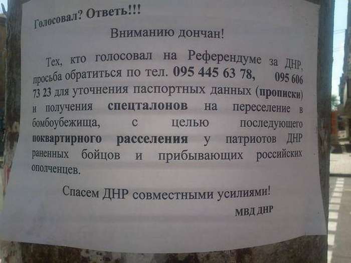 «Тех, кто голосовал на Референдуме за «ДНР» просьба обратиться по тел. ... для уточнения паспортных данных (прописки) и получения спецталонов на переселение в бомбоубежище, с целью дальнейшего поквартирного расселения раненых бойцов и русских ополченцев, которые прибывают», - говорится в объявлении.