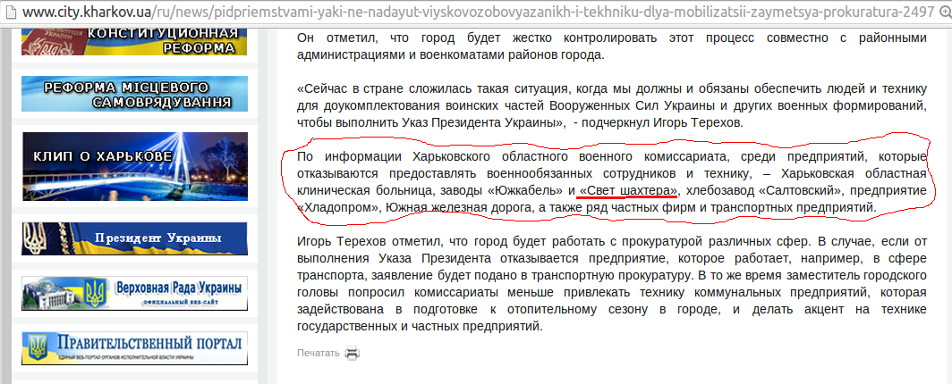 "Как уточняет Объектив со ссылкой на Харьковский областной военный комиссариат, среди предприятий, которые отказываются предоставлять военнообязанных сотрудников и технику, – Харьковская областная клиническая больница, заводы «Южкабель» и «Свет шахтера», хлебозавод «Салтовский», предприятие «Хладопром», Южная железная дорога, а также ряд частных фирм и транспортных предприятий".