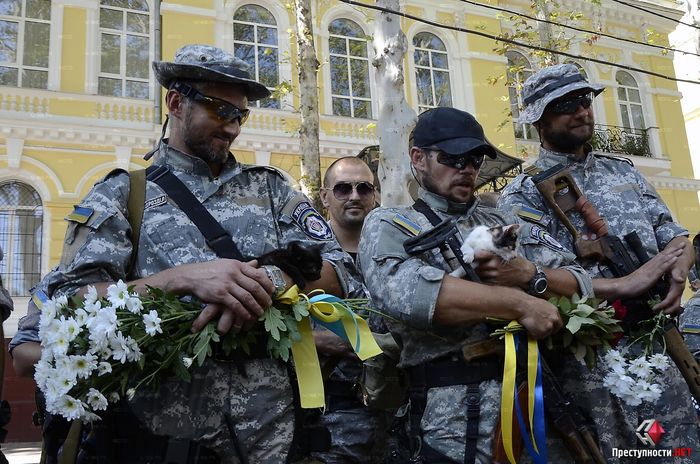 В субботу, 16 августа, в Николаеве около здания УМВД Украины в Николаевской области собрались николаевцы с украинской символикой, цветами, воздушными шарами и транспарантами, которые встречают бойцов батальона специального назначения «Николаев», более известного как «Святой Николай», которые вернулись из зоны проведения Антитеррористической операции.