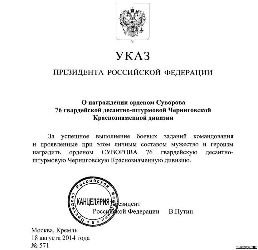 Президент России Владимир Путин наградил орденом Суворова 76-ю гвардейскую десантно-штурмовую Черниговскую Краснознаменную дивизию, принимавшую участие в захвате Крыма.