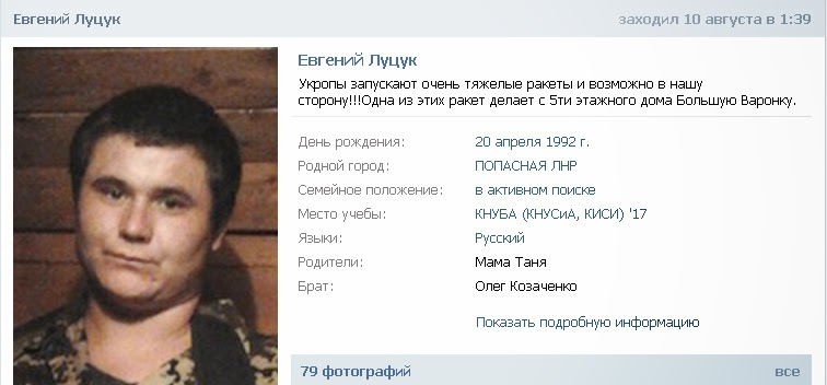 Подлежит уничтожению: Евгений Луцук - украинский террорист из Попасной 24 августа 2014 15:03 Профиль ВК https://vk.com/id133376470