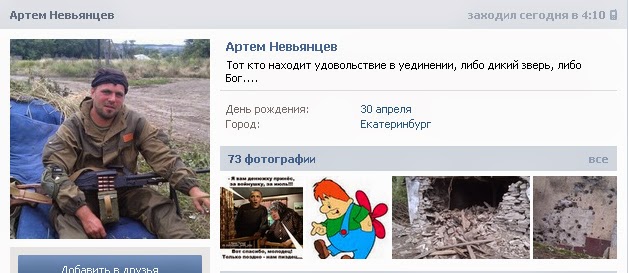 Подлежит уничтожению: Артем Невьянцев - российский террорист в Украине 24 августа 2014 15:48 Член батальона "Степь" Профиль ВК https://vk.com/id26806647
