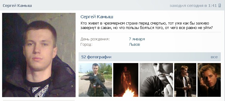 Подлежит уничтожению: Сергей Камыш - украинский террорист 25 августа 2014 07:24 Профиль ВК https://vk.com/id66380458 Хотя в анкете написано Львов, все связи указывают на место жительства - г. Луганск. Возможно работал в структуре МВД Украины.