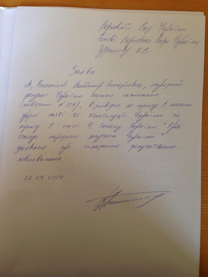 Народный депутат Украины (фракция «Батькивщина») Владимир Полочанинов написал заявление о сложение депутатских полномочий. Об этом народный избранник написал на своей страничке в «Фейсбуке».