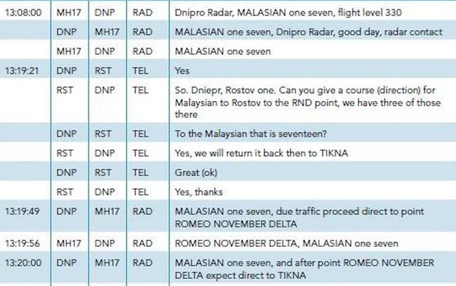В выложенных текстах экипаж Боинга 777 общается с диспетчерами из Днепропетровска (DNP) и Ростова-на-Дону а также с диспетчерами из российского Ростова (RST).