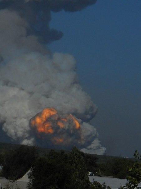 Взрыв произошел из-за попадания снаряда, над складами поднимается столб дыма.