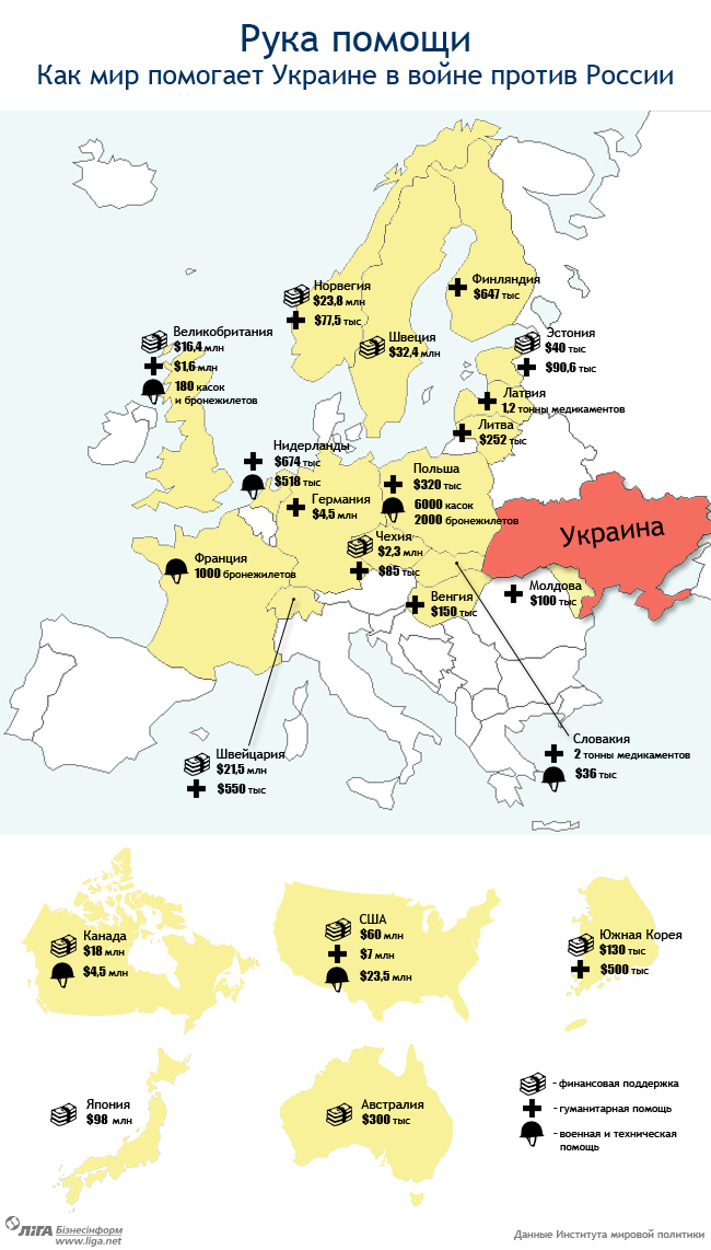 Многие украинцы продолжают сетовать на недостаточную поддержку цивилизованных стран в борьбе с российским вторжением и экономическим кризисом. В реальности многие западные страны активно помогают Украине в войне против России. Одни перечисляют деньги на реформы и армию, другие отправляют гуманитарную помощь и медикаменты, а третьи - снабжают армию бронежилетами, касками и другим снаряжением.