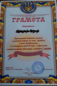 «В детском саду № 55 „Веснушка“ в Южно-Сахалинске детей, принимавших активное участие в матче по мини-футболу в честь празднования 132 годовщины города, наградили грамотами с украинской символикой», сообщает sakh.com.