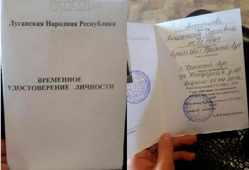В соцсетях пользователи выложили фотографию «временного удостоверения личности» ЛНР, счастливой обладательницей которого является жительница Красного Луча Анастасия Антонова, 1997 года рождения. Выдан «документ» 25 сентября краснолучским ГО МВД ЛНР и «действителен до окончания боевых действий на территории ЛНР», передает Informator. Сообщается так же, что подобное удостоверение уже выдавали в Лутугино.