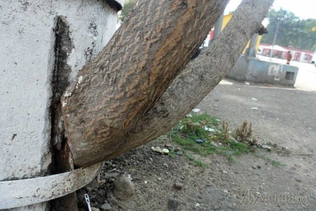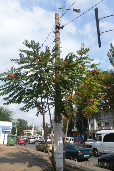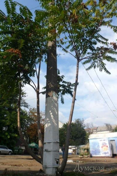 В прошлом году какое-то семечко пустило ростки прямо под столбом, а сегодня одесситы и приезжие уже могут любоваться необычным деревом, которое, несмотря на тяжелые условия, прижилось и даже дает семена.