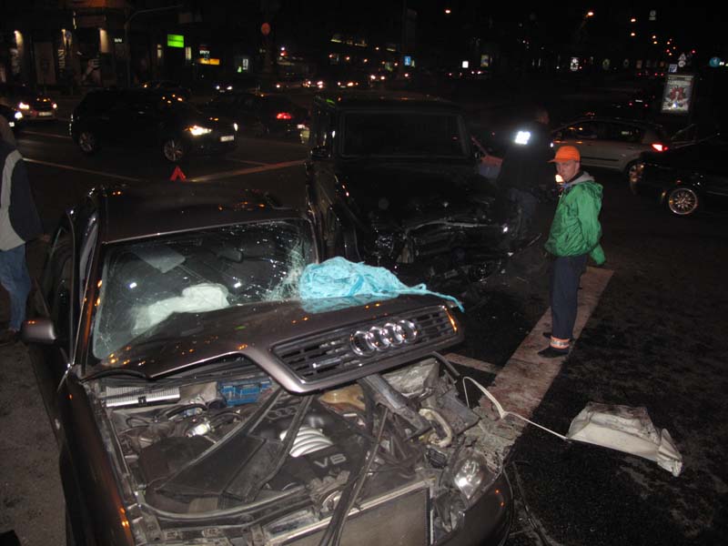 Вдруг, перед ним появился черный внедорожник — Mercedes-Benz G-Klasse-500. «Кубик» беспардонно ехал по встречке от Европейской площади в сторону Бессарабки. Мощный внедорожник цепляет впереди идущие Daewoo Lanos и Daewoo Nexia, затем таранит Audi А6.