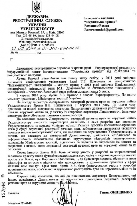 "С июня 2014 года Ярема В. В. работает в аппарате Укргосреестра. До этого момента работал в Министерстве юстиции. На должность директора Департамента регистрации имущественных прав на недвижимое имущество Ярема В. В. назначен 17 сентября 2014", - говорится в документе.
