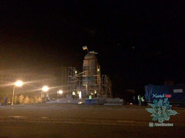 Постамент бывшего памятника Ленину на пл. Свободы в Харькове, который был снесен 28 сентября, ночью обнесли строительными лесами, сообщают в соцсетях.