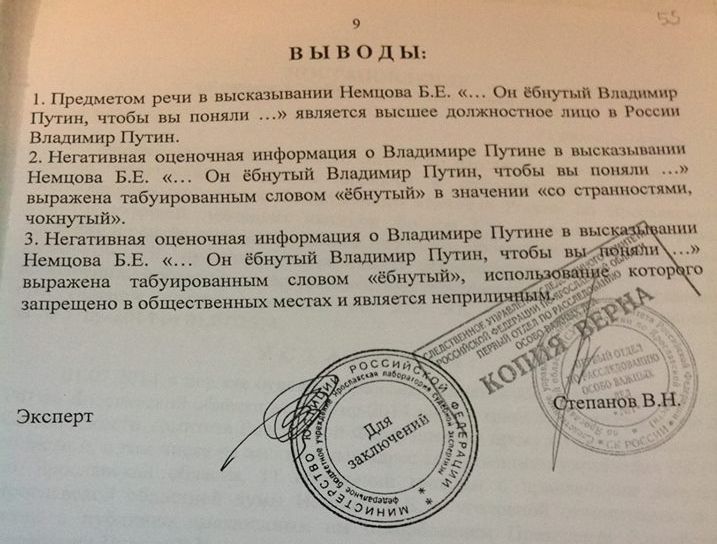 Даже для Следственного комитета это оказалось чересчур, дело передано в мировой суд по месту моего жительства. Жду заседания с целью обсудить сложившуюся в стране обстановку", - сообщил Немцов, приложив к посту фрагмент лингвистической экспертизы...