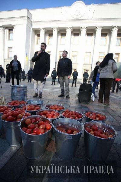 Около 40 активистов забросали помидорами портреты не пришедших на заседание Верховной Рады депутатов.