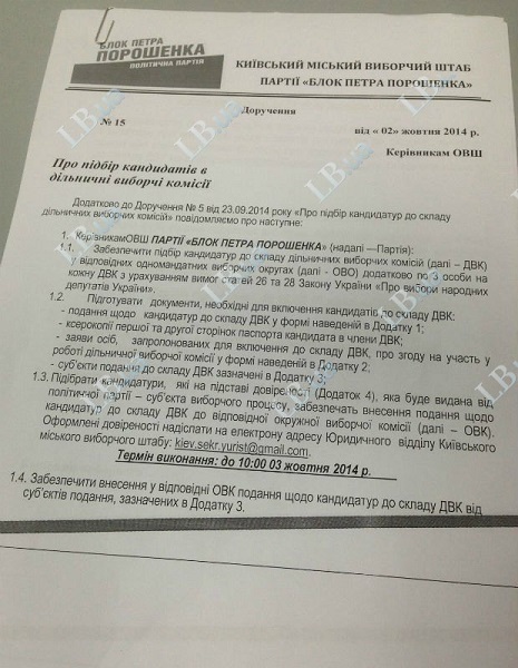 «В распоряжение LB.ua оказалась любопытная бумага. Это – внутренний документ Киевского городского штаба БПП. Озаглавлен – «поручение». Датировка – 2 октября. «Поручение» адресовано нижестоящим штабам.