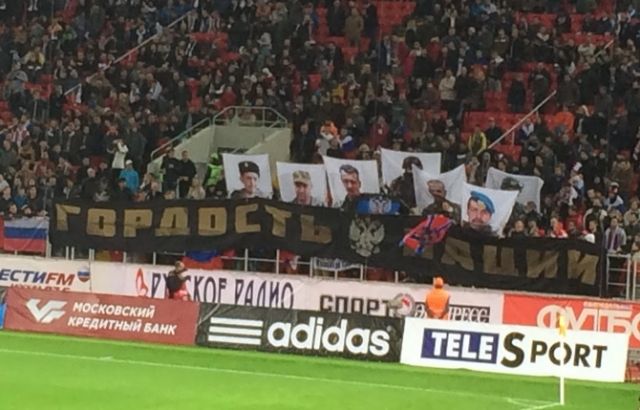 Во время отборочного матча на Чемпионат Европы-2016 болельщики российской сборной вывесили портреты боевиков, развернувших войну на востоке Украины.